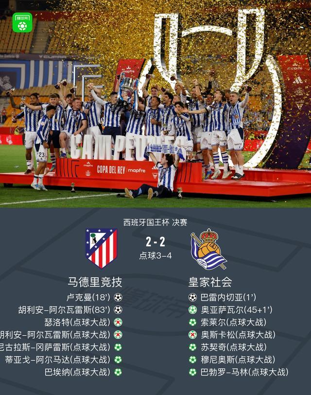 北京时间4月19日西班牙国王杯 决赛,马德里竞技对阵皇家社会。上半场巴雷内切亚闪击,卢克曼低射扳平比分,补时阶段格德斯造点,奥亚萨瓦尔点射破门。下半场82分钟阿尔瓦雷斯破门扳平比分,双方90分钟战成2-2平进入加时。加时赛双方均无进球进入点球大战。点球大战中瑟洛特、小蜘蛛失点,皇家社会最终点杀马竞夺冠。